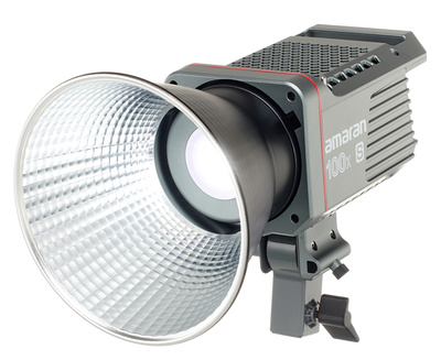 Amaran 100x S (EU version), 100W Bi-Colour LED Spotlight, Compact and lightweight lamp head, Easy-to-use, minimalist user interface, Up to 45,400 lux at 1 metre distance with hyper reflector, Very high colour quality, Improved spectral continuity and light quality, Infinitely dimmable from 0-100, Bowens Mount, Sidus Link app control, Built-in shade holder, Integrated, silent cooling system, 9 Lighting effects, Colour temperature: 2700 – 6500 K, CRI 95+, TLCI 97+, CQS 97+, SSI (D32) 99, SSI (D56) 89+, TM-30 RF (average): 96, TM-30 RG (average): 102, Brightness: 8,788 lm, Beam angle: 110.4° (without reflector), 17.9° (with hyper reflector), DC power supply: 48 V, AC power supply: 100 V – 240 V / 0.95 – 2.7A, Control methods: On-board, Sidus Link App, Range in Bluetooth mode: approx. 80 m, Dimensions lamp head without mounting bracket: approx. 21 x 11.5 x 11.5 cm, Lamp head with mounting bracket: approx. 21 x 12 x 20 cm, Total weight: 3.3 kg, Lamp head approx. 1.5 kg, Power supply unit approx. 490 g, Includes Bowens Mount protective cover, Bowens Mount hyperreflector, AC power supply and AC power cable with 3 m length