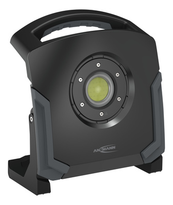 Ansmann WL60W 18V Hybrid, Rechargeable or Wired Work Light, with handle and base, Positioning: 90° swivelling, Light source: COB LED, Light modes: 25%, 50%, 75%, 100% brightness, Brightness: Up to 6350 lumens, Light range: Up to 95 metres, Compatible rechargeable batteries: Bosch, Milwaukee/DeWalt and Makita brands (not included), Operation also possible with the included cable, Protection rating: IP65 (when using rechargeable battery) or IP44 (when using mains power), USB-C connection, Dimensions (W × H × D): 252 × 290 × 170 mm, Weight: 3.5 kg, Colour: Anthracite, Includes three adapter plates for the applicable battery types, power cord and operating instructions