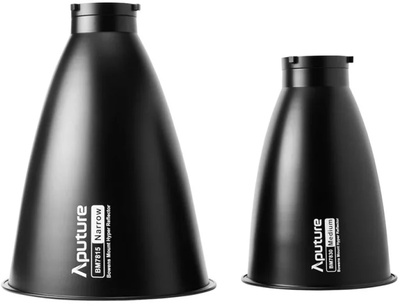 Aputure Storm 1000c/1200x Reflector, Reflector Kit, Kit consisting of a narrow 15° and a medium 30° reflector, Suitable for Aputure Storm 1000c/1200x, Even light spread from one edge to the other, Without hotspots, The reflector set’s transport bag fits securely on the STORM 1200x’s rolling case, thus simplifying the transport of both devices, Includes transport bag@+*Technical data:*, Light angle: 15° (narrow reflector), 30° (medium reflector), Dimensions: 32.0 x 41.4 cm (narrow reflector), 23.0 x 33.0 cm (medium reflector), 39.5 x 39.5 x 50.5 cm (transport bag), Weight: 1.4 kg (narrow reflector), 0.9 kg (medium reflector), 3.47 kg (transport bag)