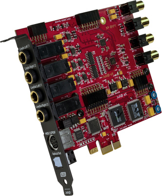 ESI Juli@ eX, PCIe Audio Interface, Sabre ESS converter with 32bit / 192kHz, EWDM driver for low latency, Interchangeable I/O panel: RCA (unbalanced) or TRS (balanced), Digital inputs and outputs S/PDIF (optical/coaxial), MIDI I/O via breakout cable, AC3-/DTS compatible, Dimensions (W x D x H): 140 x 130 x 20 mm, Weight: 164 g, Includes software (download): Wavelab LE, Bitwig 8-Track und JackTrip (3-month subscription)