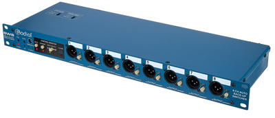 Radial Engineering SW-8, 8-Channel line level auto switcher, Redundant backup switch, For live applications from previously recorded backing tracks, Switches to a second backup multi-track system if an error occurs in the main path., Silent switching, 8x XLR outputs, 2x 8 Jack inputs, 1x 8-Channel 25-pin D-Sub output, 2x 8-Channel 25-pin D-Sub input, Contact inputs and outputs, Ground lift switch, Frequency range: 20 – 20,000 Hz, Gain: -20 dB, Dimensions 44.5 x 15.25 x 4.5 cm, Design: 19″ / 1 HE, Weight: 4.4 kg