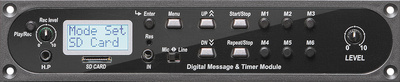 RCS DMT-10, Digital Text Module, For installation in empty compartments of small control centres, module racks (ME-2A) or ELA amplifiers, Use as an advertising text device or for playing attention signals (pause chime), 6 memory texts via front buttons, external contacts or with desktop intercom, Add texts via LINE signal (recording), Dynamic microphone (recording) or microSD card (recording), Timer function for 26 texts / signals with weekly function, Alarm contact (pulse/continuous contact) can be connected to the priority signal with override function, Power supply: 15V – 18V DC, Current consumption: 150 mA, Dimensions (W x H x D): 194 x 40 x 85 mm, Weight: 0.27 kg