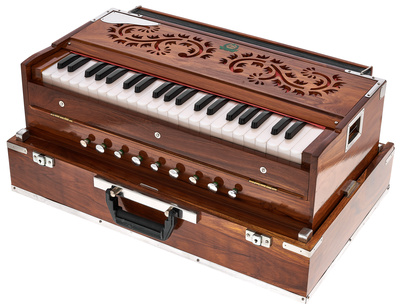 Thomann Nataraj Harmonium Foldable NH4, Harmonium, 1st row of reeds in bass tuning, 2nd row of tongues in male tuning, Pedalton push-pull register for roots, octaves, thirds, fifths and sevenths, Fold out, Detachable lid, Housing with protective aluminium edges, Instrument and case made of teak, Bellows made of buffalo leather, Height when folded up: approx. 19 cm, Height when folded out: approx. 26 cm, Length: approx. 61 cm, Width: approx. 37 cm
