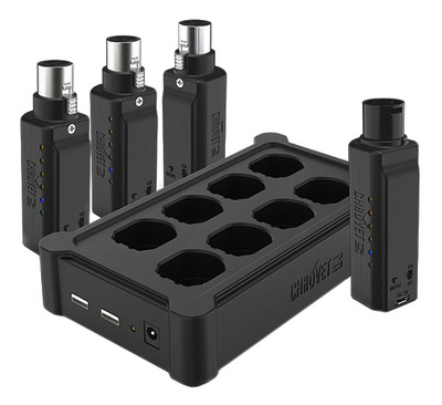 Chauvet DJ D-Fi XLR Pack, Set pour communication DMX sans fil, Contient 1 émetteur, 3 récepteurs et 1 multi-chargeur, Le multi-chargeur peur recharger simultanément jusqu’à 8 D-Fi XLR, Broches de contact permettant de charger tous les D-Fi-XLR sans aide de câbles, Comprend 2 ports USB supplémentaires pour charger des appareils externes, Tension d’entrée: 5 V DC, 500 mA (alimentation externe: 100-240 V AC, 50/60 Hz), Puissance/courant: 19 Watt, 0.3 A sous 120 V, 60 Hz, Homologations: CE, FCC, RTTE, Dimensions du multi-chargeur: 270 x 186 x 112 mm, Poids du multi-chargeur: 200 g