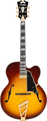 DAngelico Excel EXL1 Dark Iced Tea Burst, Electric Guitar, Type: Hollow body with single cut, Top: Laminated spruce, Back and sides: Flamed maple, Neck: Maple / walnut / maple, Fingerboard: Ebony, Fingerboard inlays: Mother-of-Pearl split blocks, Neck profile: C, 7-Ply body binding, Scale: 648 mm, Nut width: 43 mm, 22 frets, Pickup: Seymour Duncan Johnny Smith Floating Mini-bucker, 1 volume control, 1 tone control, EG2P jakc socket, 5-ply black pickguard, D’Angelico Stairstep Tailpiece, Grover 150 Imperial machine heads, Gold-plated hardware, Colour: Dark Iced Tea Burst, Includes case