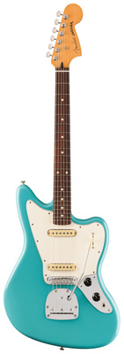 Fender Player II Jaguar RW AQB, Guitare électrique, Corps en aulne, Manche vissé en érable, Touche en palissandre, Repères « points » blancs, Profil du manche: Modern C, Rayon de la touche: 241 mm (9,5″), Diapason: 610 mm (24″), Largeur au sillet: 42 mm (1,65″), Sillet en os synthétique, 22 frettes Medium Jumbo, 2 micros simple bobinage Player Serie Alnico 5 Jaguar, 1 réglage de volume général, 1 réglage de tonalité général, Sélecteur 3 positions, Pickguard 3 plis parchemin, Chevalet Jaguar avec pontets Mustang et vibrato flottant style Vintage, Mécaniques Fender ClassicGear, Accastillage nickel/chrome, Cordes Fender USA 250L Nickel Plated Steel .009-.042, Couleur: Aquatone Blue