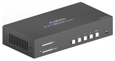 PureLink PureTools PT-SW-HD41USB, Commutateur HDMI 4×1 4K 18 Gbit/s, Avec KVM et extraction audio, Entrées: 4x HDMI-A, Sorties: 1x HDMI-A, 1x stéréo analogique (mini Jack 3,5 mm), Connexions de contrôle: 4x USB hôte (USB-B), 3x USB périphérique (USB-A, max. 1 A), 1x RS232 (Phoenix 3 broches), 4x Breakout (Phoenix 3 broches), 1x Firmware (micro USB), Résolution max.: 4K UltraHD à 60 Hz (4:4:4), HDR10, Dolby Vision, Bande passante: 18 Gbps, Boîtier en métal, Dimensions: 200 x 40 x 100 mm, Poids: 0,685 kg, Couleur: Noir, Kit de montage (2 équerres avec 4 vis, 4 patins en plastique), 4 bornes à vis Phoenix 3 broches et bloc d’alimentation 12 V / 2 A incl.
